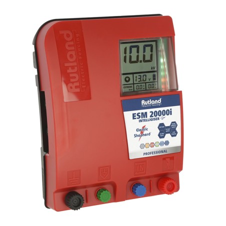 Elstängselaggregat RUTLAND ESM 20 000i, 12 Volt & 230 Volt. Lagrad energi: 20.0 Joule. Utgående energi: 15 Joule. ESM 20 000i är ett multivolts elstängselaggregat för elstängsel som går att köra på både 230 Volt och 12 Volt. Levereras med 230 V nätadapter och 12 V batterikabelsats.